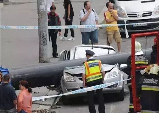 天灾人祸,防不胜防啊!在匈牙利的布达佩斯的街道上,发生了一起吊车意外事故。侧翻的吊车狠狠的砸在路旁停放的小轿车上,庆幸的是,当时车主离开汽车吃饭去了,车内并没有人,否则后果不堪设想呀!