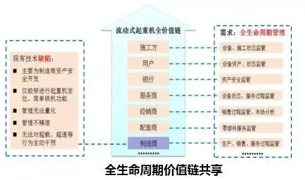 同时三个平台打通,将对起重机全生命周期价值链管理产生质的影响。对起重机制造商可提供现有技术缺陷,明确革新方向;对配套商可协助零部件服务监管;对客户提供设备资产、状态监督等。从而未来可实现施工方、用户、银行、服务商、经销商、配套商、制造商等多环节互通协作,实现全生命周期价值链共享。